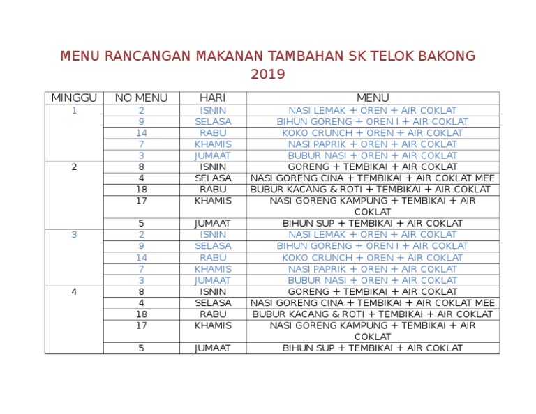 Menu Rancangan Makanan Tambahan Sk Telok Bakong 2019 Minggu No Menu Hari Menu